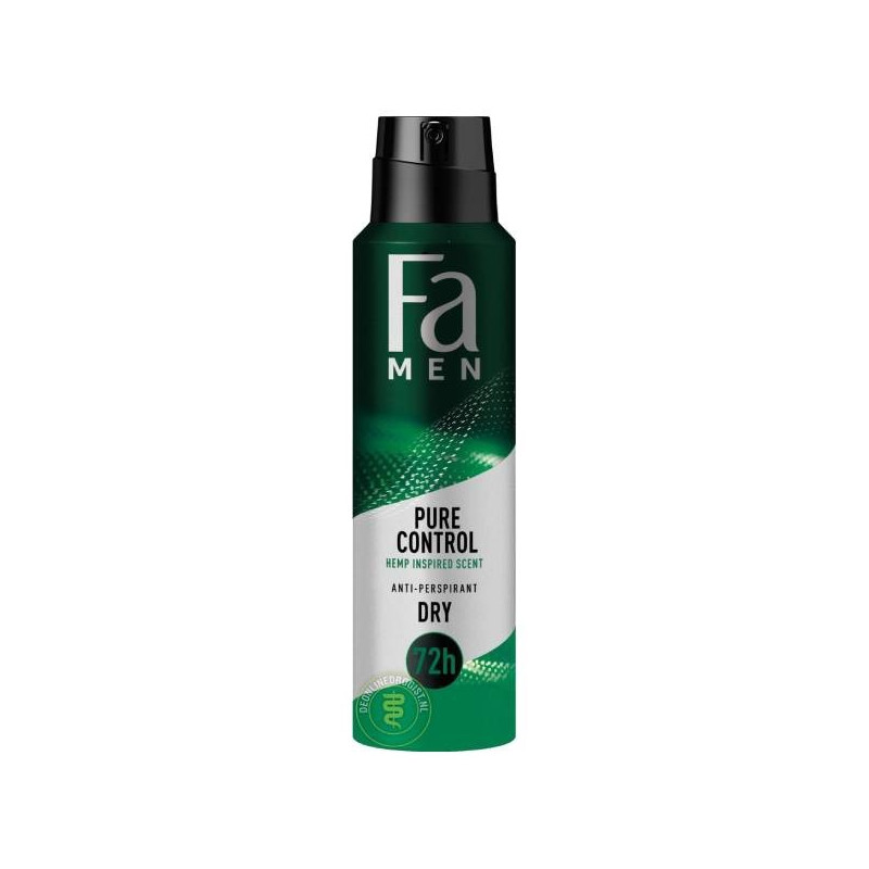 Fa Men 150 ml Pure Control antiperspirant s vůní inspirovanou konopím. Technologie proti skvrnám a ochrana proti tělesnému pachu a vlhkosti až na 72h.