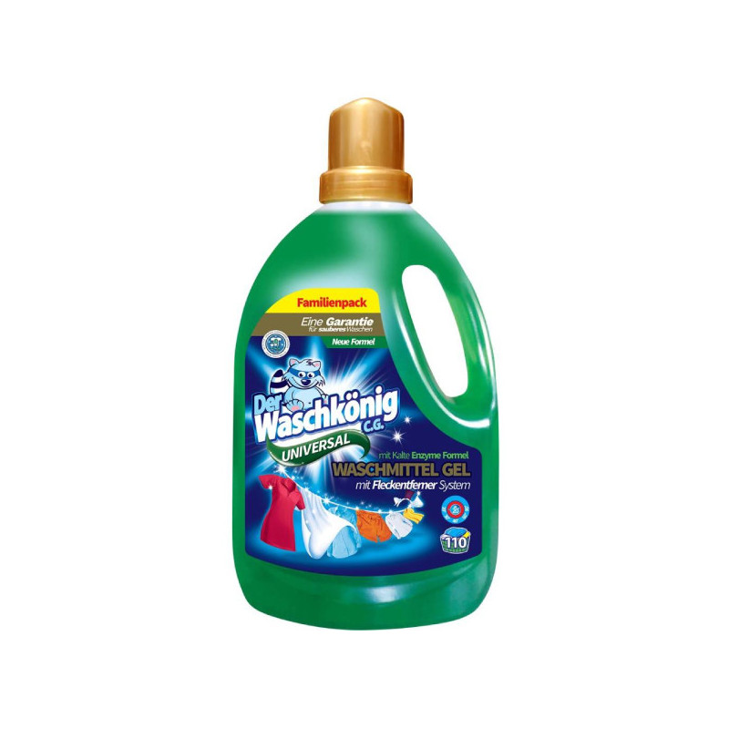 Waschkönig Universal je německý prací gel pro bílé a stálobarevné prádlo s formulí pro odstranění nečistot a skvrn již od 20 °C při zachování barev.