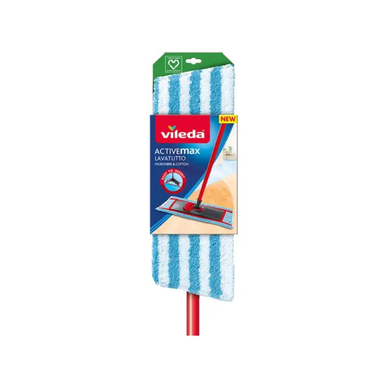 Plochý mop s tyčí Vileda ActiveMax je vysoce kvalitní plochý mop kombinující polyesterová a bavlněná vlákna. Jeho vlákna zachycují nečistoty a prach a poskytují vysokou nasákavost. Je navržen speciálně pro dlaždice, ale lze jej taky dobře využít pro čištění laminátů a dřevěných podlah.