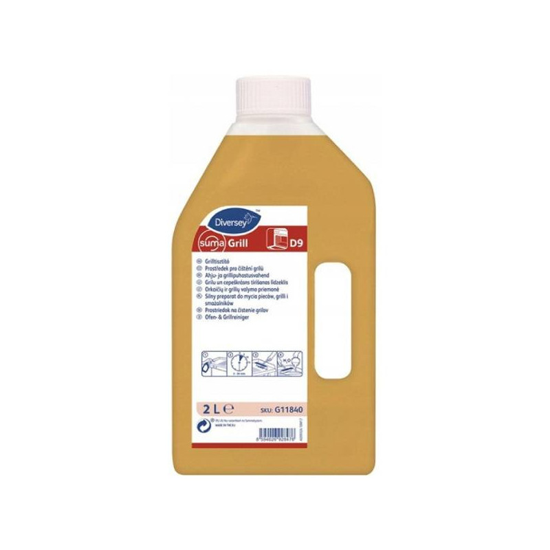 Alkalický čisticí prostředek Suma Grill D9 pro čištění silně znečištěných grilů, konvektomatů, fritéz, sporáků, pečících trub apod. Snadno odstraňuje i napálené zbytky potravin. Je vhodný pro povrchy z nerezové oceli. Snadno odstraňuje i napálené zbytky potravin. Lze použít i na čištění konvektomatů bez automatického systému mytí.