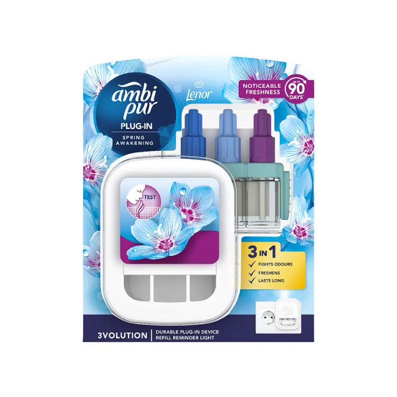 Osvěžovač vzduchu do zásuvky Ambi Pur 3Volution s chytrým programováním nepřetržitě bojuje s pachy a střídá 3 vzájemně se doplňující vůně pro svěžest, kterou nepřestanete vnímat. Vydrží až 90 dnů (při používání 12 hodin denně s nastavením nejnižší úrovně odpařování). Svěží vůně má větší dosah, aby naplnila celý váš pokoj svěžestí. Lenor Spring Awakening má lehkou vůni inspirovanou jarní přirozenou svěžestí od Lenoru.