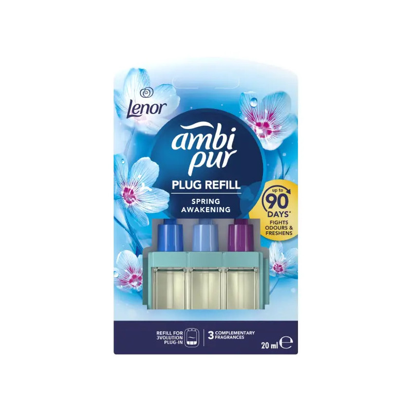 Osvěžovač vzduchu do zásuvky Ambi Pur 3Volution s chytrým programováním nepřetržitě bojuje s pachy a střídá 3 vzájemně se doplňující vůně pro svěžest, kterou nepřestanete vnímat. Vydrží až 90 dnů (při používání 12 hodin denně s nastavením nejnižší úrovně odpařování). Svěží vůně má větší dosah, aby naplnila celý váš pokoj svěžestí. Lenor Spring Awakening má lehkou vůni inspirovanou jarní přirozenou svěžestí od Lenoru.