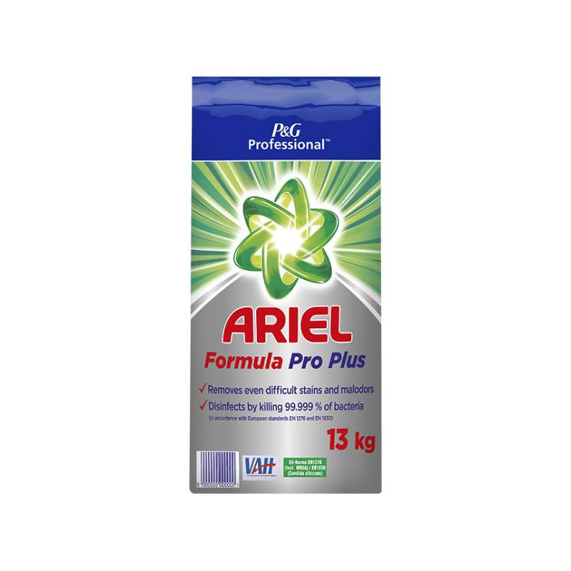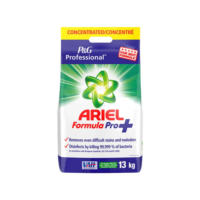 Ariel Formula Pro je dezinfekční prací prášek pro profesionální použití v oblasti zdravotní a sociální péče. Odstraňuje nejodolnější skvrny a zabíjí 99,999 % bakterií a obalených virů (dle EN1276, EN1650 a EN14476, reg. číslo MZDR 31057/2022/OBP, dodržujte návod k použití). Je vyvinutý tak, aby dosahoval vynikajících výsledků už při prvním praní bez nutnosti namáčení anebo předpírky. Obsahuje speciální bělicí technologie, které pomáhají udržet prádlo zářivě bílé po delší dobu. Obsahuje jedinečnou kombinaci vysoce koncentrovaných čisticích složek nové generace. Kombinuje pokročilý systém povrchově aktivních látek s technologicky vyspělými enzymy a polymery, které jsou velmi účinné při odstraňování odolných skvrn a snadno pronikají do hloubky vlákna. Dosahuje vynikajících výsledků praní už při 40 °C. Neobsahuje fosfáty. Jedno balení vypere více než tunu prádla. Biocidní (dezinfekční) prostředky používejte zodpovědně dle návodu k použití.